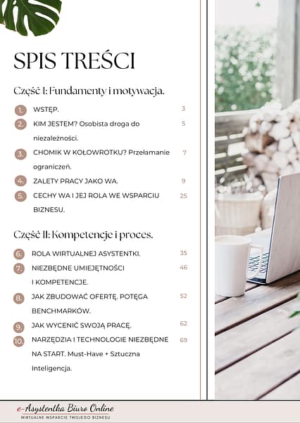 i strategię, jak rozpocząć pracę jako WA. Chcę podzielić się swoją wiedzą, opowiedzieć jakich błędów unikać, abyś Ty nie musiała ich powtarzać. Przez ostatnie 10 lat współpracowałam na różnych płaszczyznach z ponad 60-cioma różnymi biznesami. Zdobyłam ogromne doświadczenie i wiele życiowo-zawodowych lekcji, które pomogły mi poukładać swój biznes tak, że dziś mam swój zespół WA i pracuję 4 h dziennie. W e-booku opisałam też jak zacząć formalnie, jakie kody PKD wybrać, gdzie szukać klientów, jak sobie z nimi radzić, jak wycenić pracę, rozwijać markę i więcej.